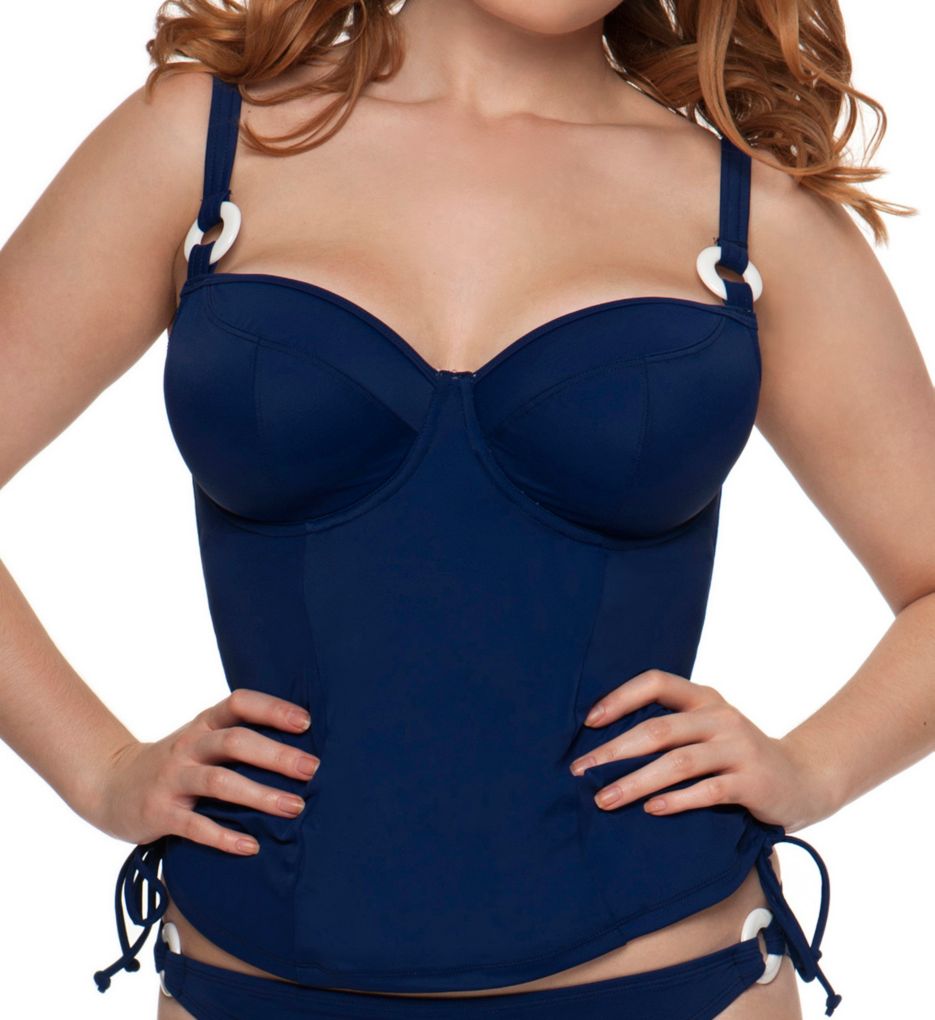 This is the balcony underwire tankini top in this collection, pictured with the mini swim brief. This tankini top is currently available in sizes 30D to F, 32 to 38D to H and 40E to H!The adjustable side ties of this tankini style and it’s front seams help make this a very flattering, go to swimwear style!